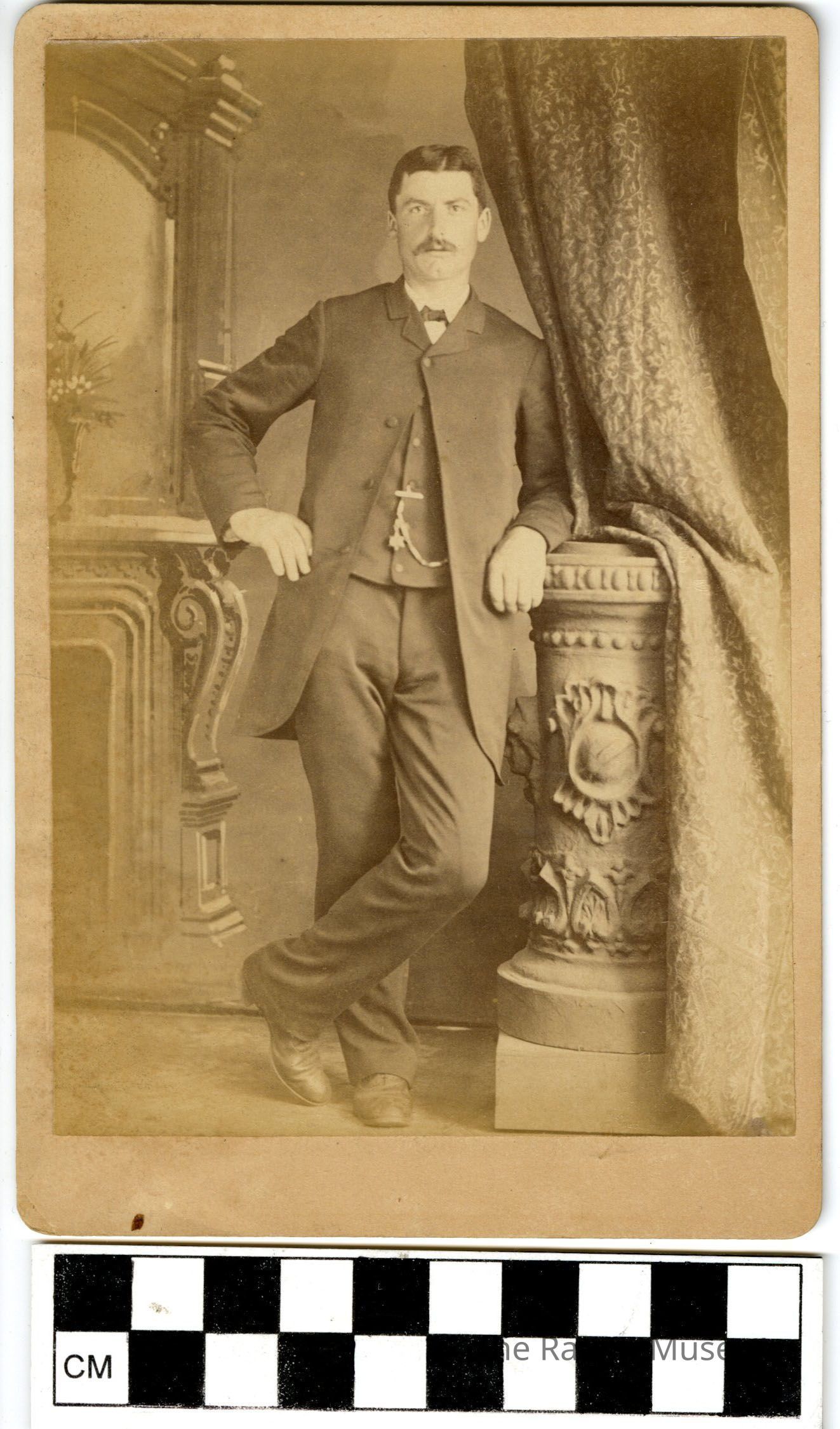 One (1) black and white sepia toned photograph of George Anton "Tony" Weidner. George is standing, while leaning on his left side with his arm resting on a waist high decorative pillar/bannister of stairs. He has his left leg crossed in front of his right. To his left is a curtain, and behind his right is a fireplace with bouquet of flowers on the mantel and mirror behind it. George is wearing a three piece black suit with white undershirt. His vest has a chain with star attached. His right hand is on his hip.
