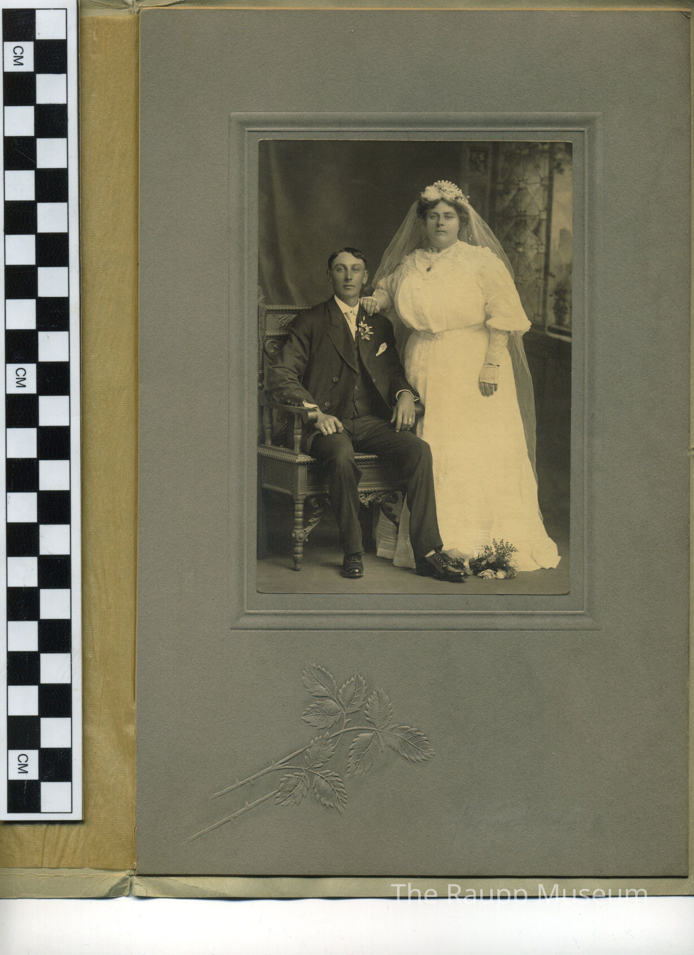 Black and white image mounted to gray cardstock presented in a heavy textured paper folder. Professional wedding portrait. Image of George Horcher and Elizabeth Raupp.