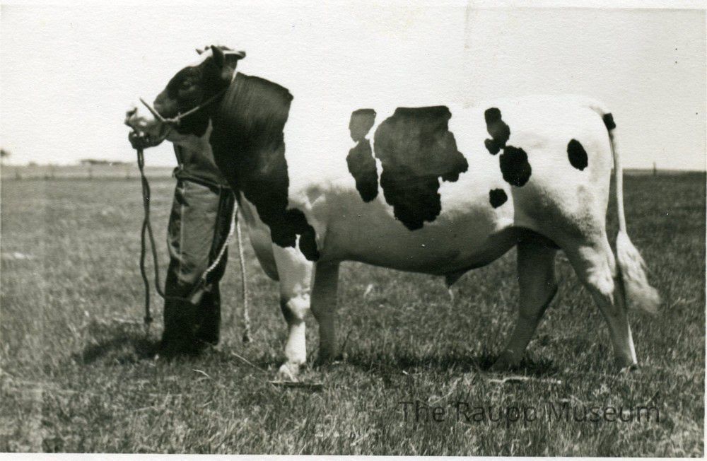 One (1) black and white print mounted on textured card. Image of George Leikam standing behind the head of his champion bull with field in the background. Only his legs and part of torso are visible in the picture. The cow has a black head and spots, standing in profile with its head pointing to the left. Faint stamp on the reverse "1940" and illegible pencil writing.Relationships