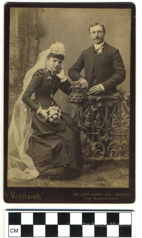 Black and white photograph mounted to brown card. Image of Clara Klein seated on left wearing long veil and dark suit dress with her arm resting on a railing. George Weidner is standing behind the rail and also leaning on it. He is dressed in a suit with white flowers pinned to the lapel. Card has photography studio information embossed across lower border. reverse side has pencil inscription across lower edge: "Mr & Mrs George Weidner."Dimensions