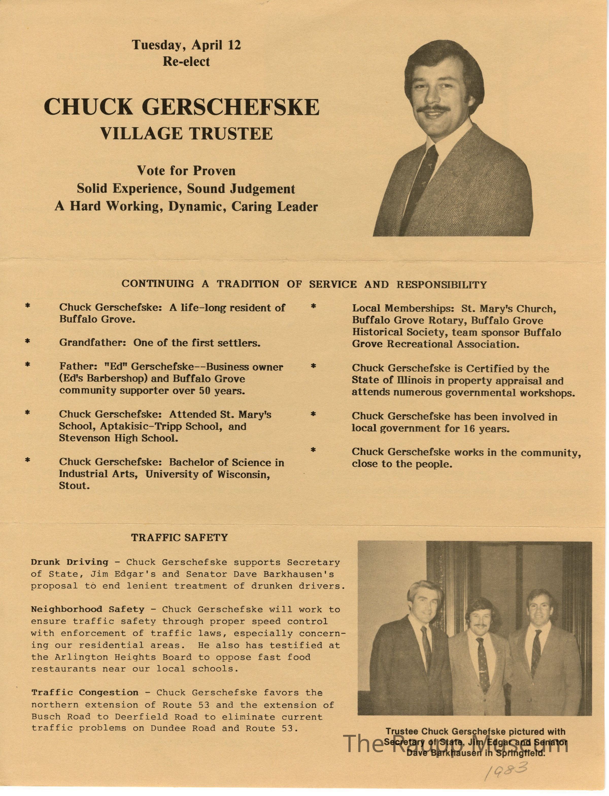 One (1) brown pamphlet for Chuck Gerchefske for village trustee election. Has photos and text on both sides, b/w.