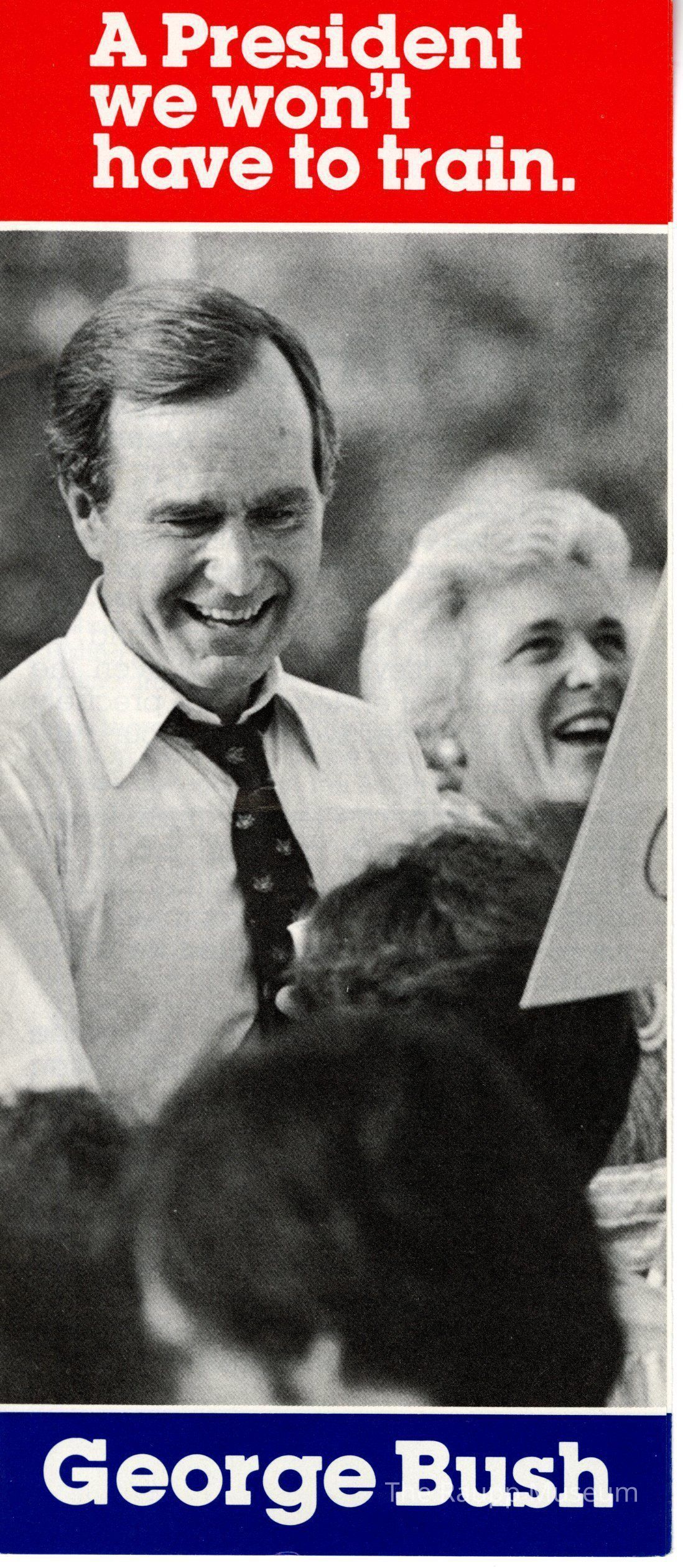 One (1) red, white, and blue election pamphlet for George Bush. Has photo on front cover and paragraphs inside.Archive Details
