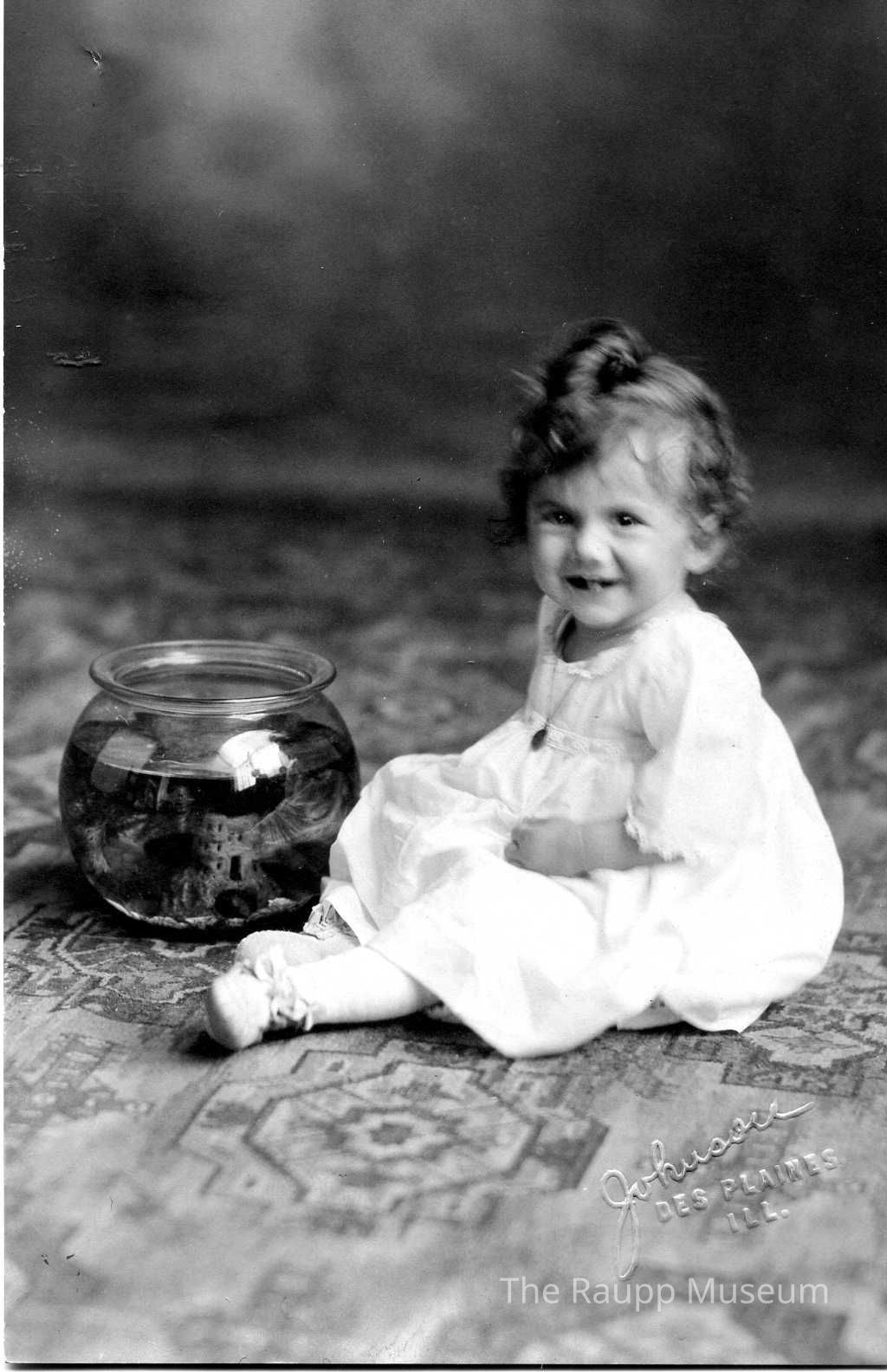 Black and white portrait printed on a postcard. Image of a child wearing a white dress sitting on a patterned carpet near a fish bowl. Girl is Gladys Welter at one year old. Photographer name embossed in lower right corner on front.