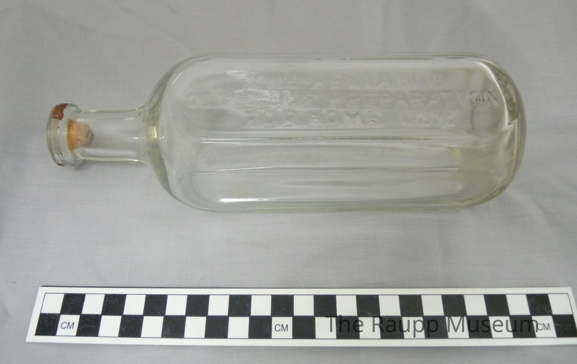 One (1) clear glass bottle. Bottle is rectangular with rounded sides, and a narrow neck with cork in the top. Embossed on one side is: "Prepared by Dr Peter Fahrney & Sons Co. Chicago, ILL USA." and on the other side "The reliable old-time preparation for home use" and on the bottom "Fahrney Chicago".