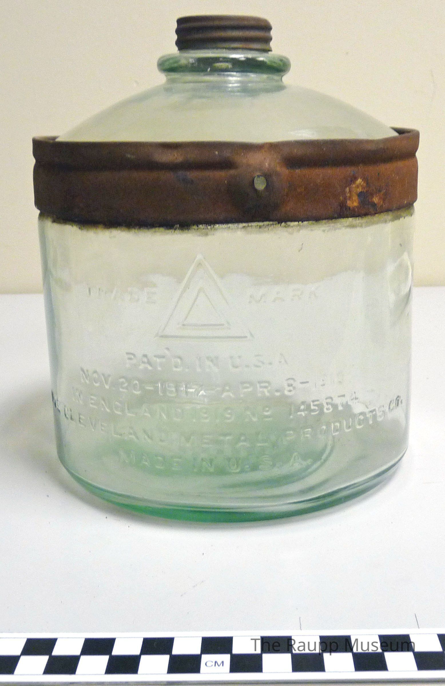 Round, transparent green glass jar with tapered spout. Metal bands around upper circumference of body and spout. Embossed text on body: trade mark (triangle shape) pat'd in USA; Nov.20- 1917- Apr. 8-1919 in England 1913 N2 145874; the Cleveland Metal Products Co. Made in USA." Used for storing coal oil.