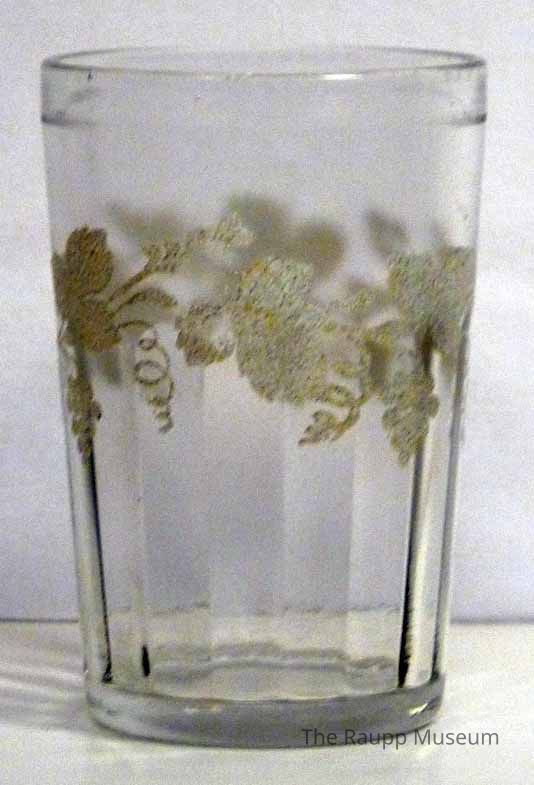 Round, clear juice glass; white floral embossed design around circumference, fluted lower half.