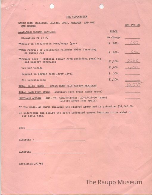 One black and white copy of the Gloucester housing development custom feature choices and price list printed on pink paper. Two hole punches along upper edge.Archive Details