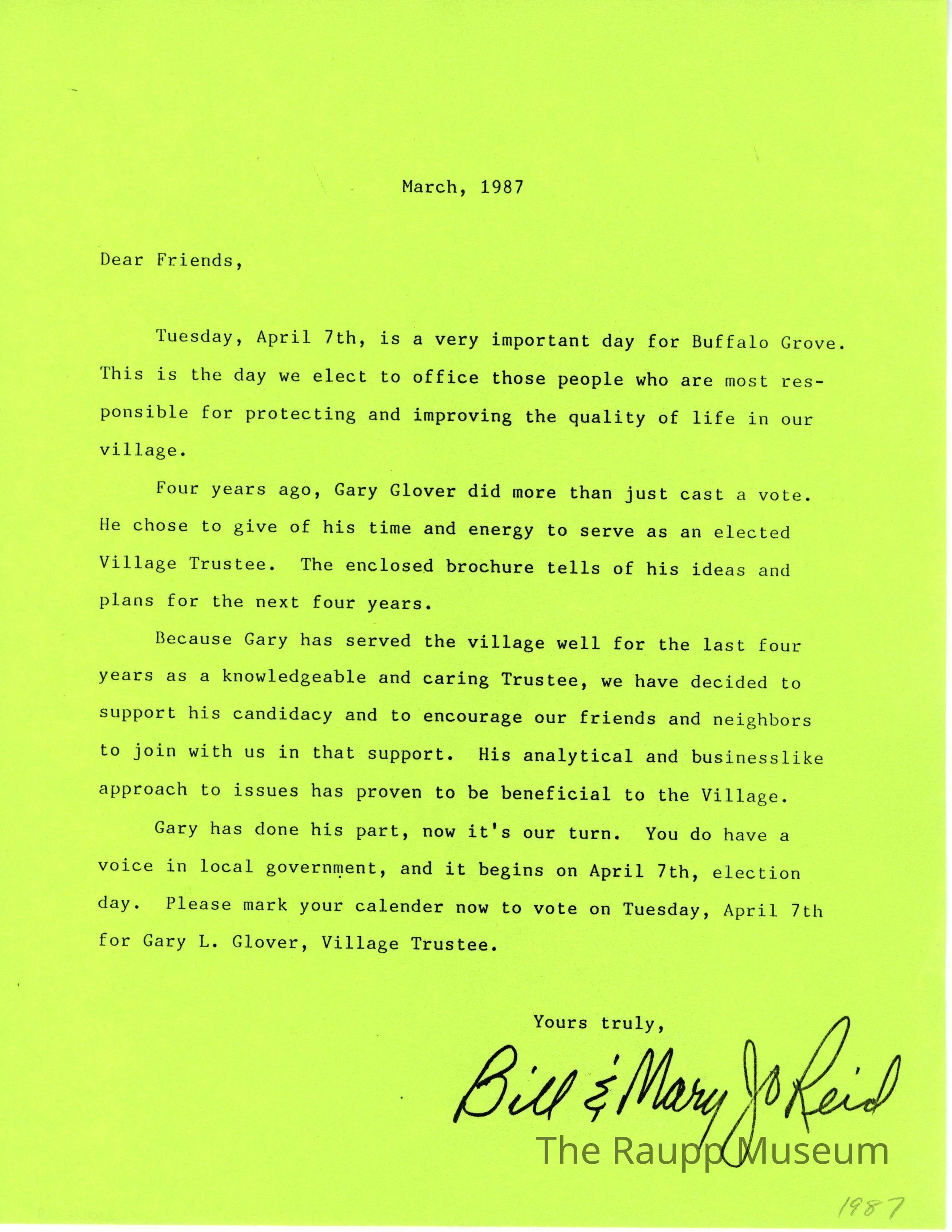 One (1) green typed letter from Bill and Mary Reid to voters, outlining Gary Glover as candidate for village trustee.