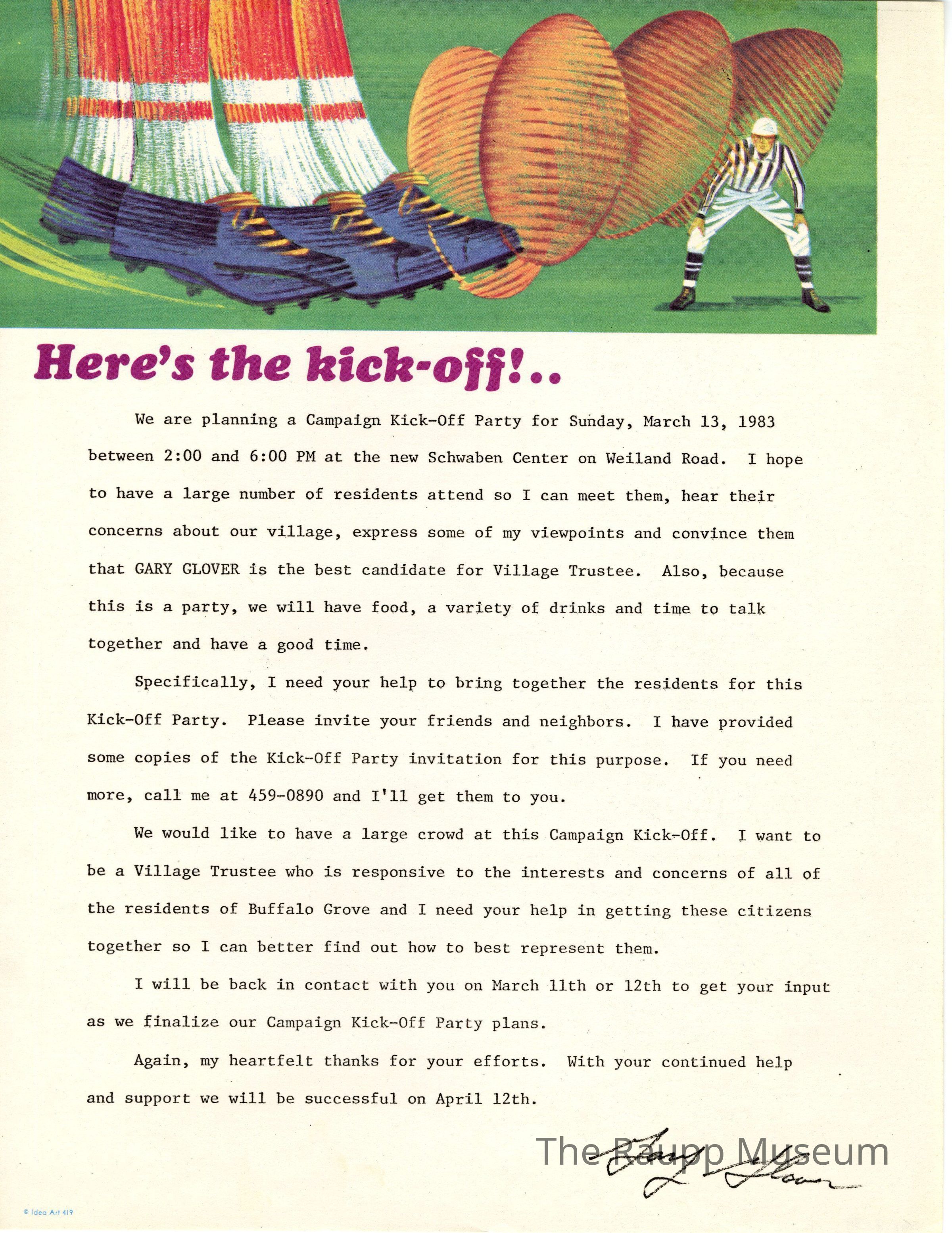 One (1) multicolored, typed election pamphlet and information for Campaign Kick Off party for Gary Glover on March 13, 1983. Has football drawing on top.