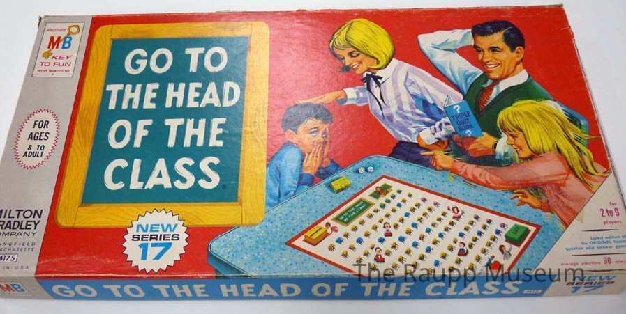 Board game "Go to the Head of the Class" with marks 4175 and box with separate lid. Box lid has a red background and illustration of a family playing the game. Game board is mounted to a heavy cardboard backing with a center horizontal fold. lt has an illustration of a classroom with 100 desks. Game includes a set of green cards, a set of yellow cards, two dice, eight cardboard game pieces and plastic stands.Dimensions