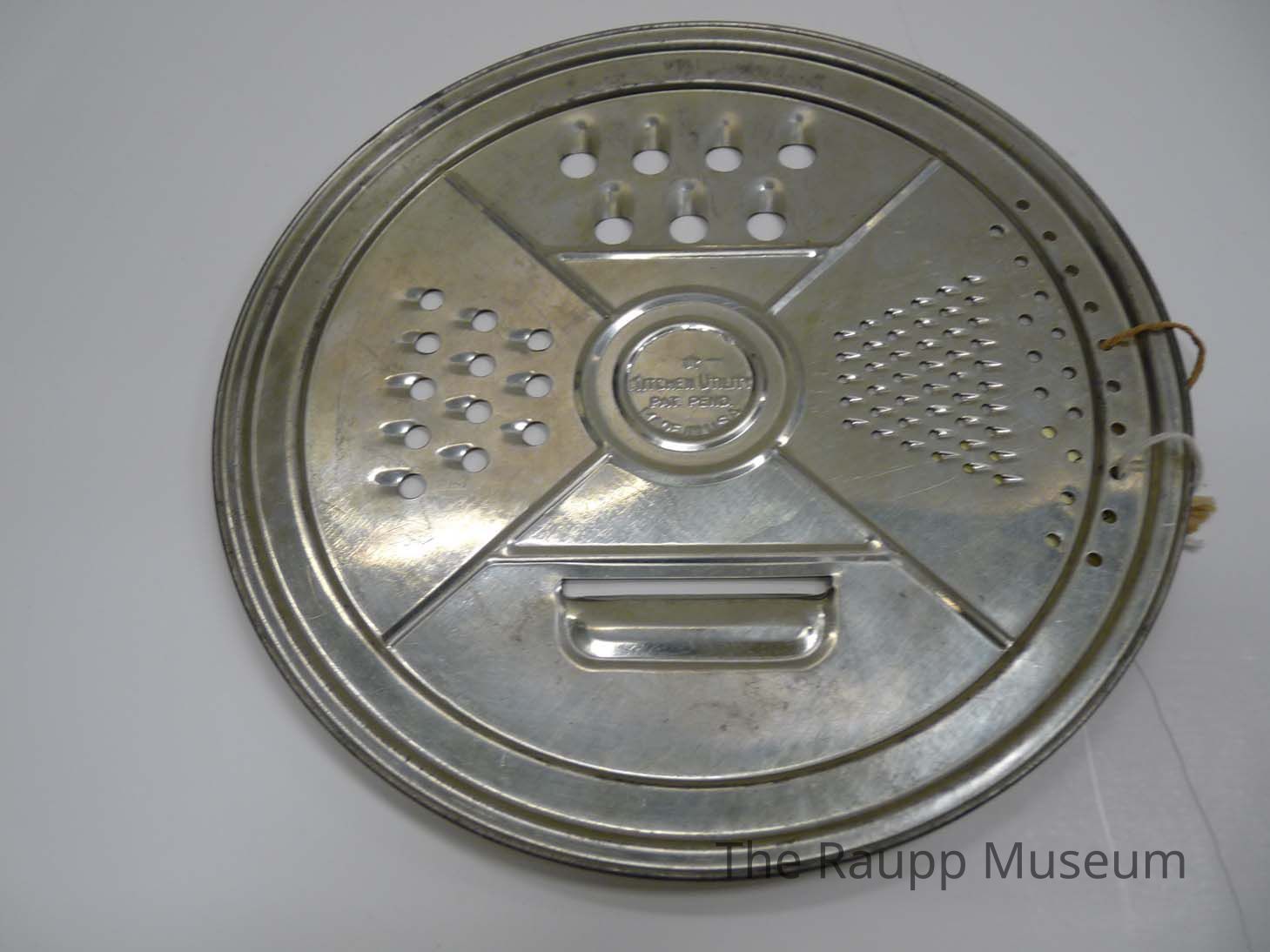 Round, silver metal grater. With four different sized planes for grating.