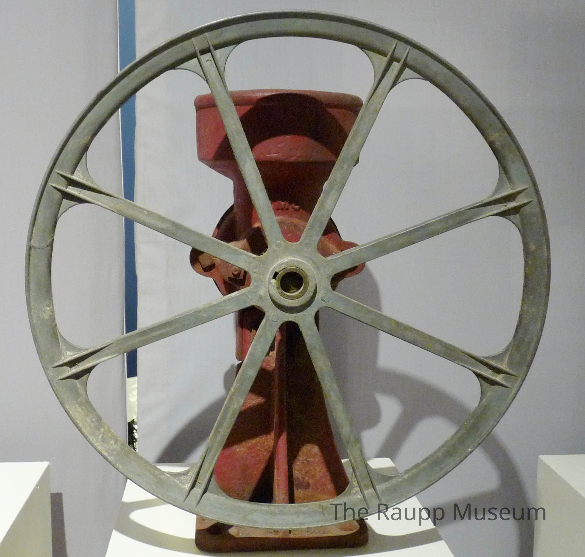 Red cast iron hopper grinder with large wheel attached to the front. Hopper open at the top and has 6-inch by 6-inch base. Grey metal wheel with eight radiating spokes mounted to front of hopper. Embossed text on the grinder hopper: 2MB. Used for grinding corn or bone.Dimensions