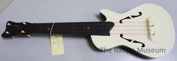 A black and white plastic four-string toy guitar; black plastic backing and neck with a white face and white tuning knobs. Four red plastic strings; two f-holes for acoustics.Dimensions