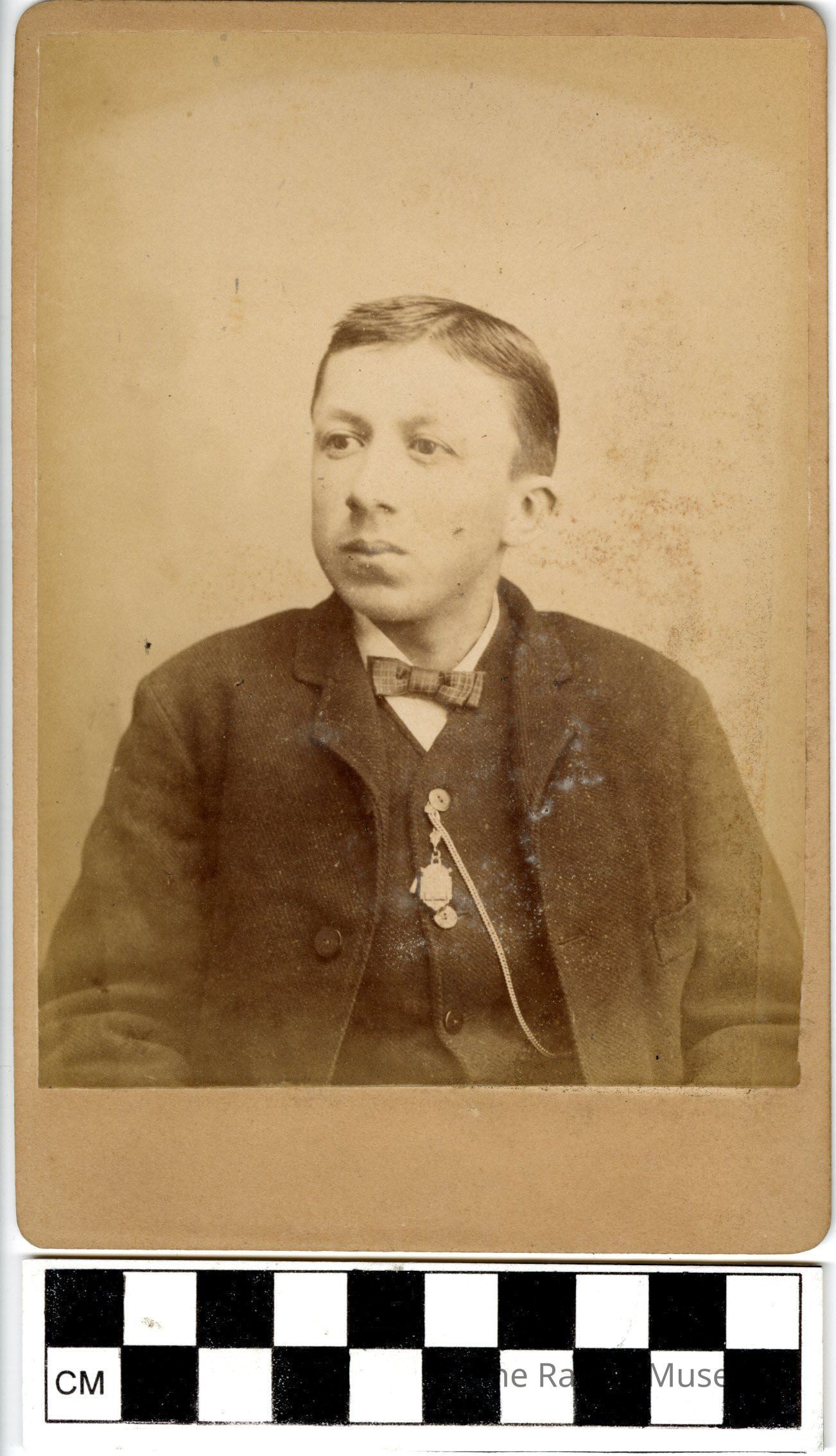 One (1) black and white photograph of a man from the waist up. Identified in the photo album as "Hahn (?) Zimmer". The man is looking to his right. He is wearing a three piece dark suit with white undershirt and dark bowtie. He has on a silver chain attached to the first button of his vest.