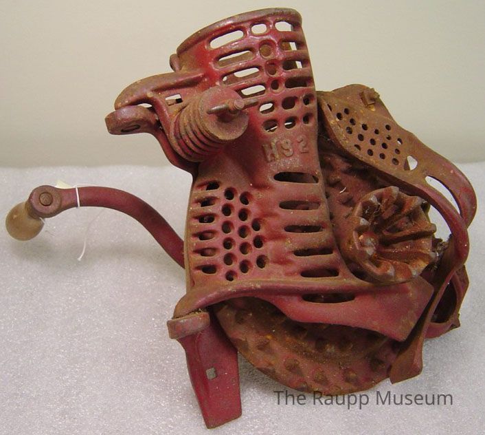 One (1) red metal hand corn sheller. Gear with teeth operated by a hand crank - Top has opening for cob of corn with opening on bottom for loose corn and cob. There is a spring set to tension. Marks include: "HS2" on front cylinder, "HS1" on back of cylinder, "HS3" on toothed gear and "HS8" on back.Dimensions