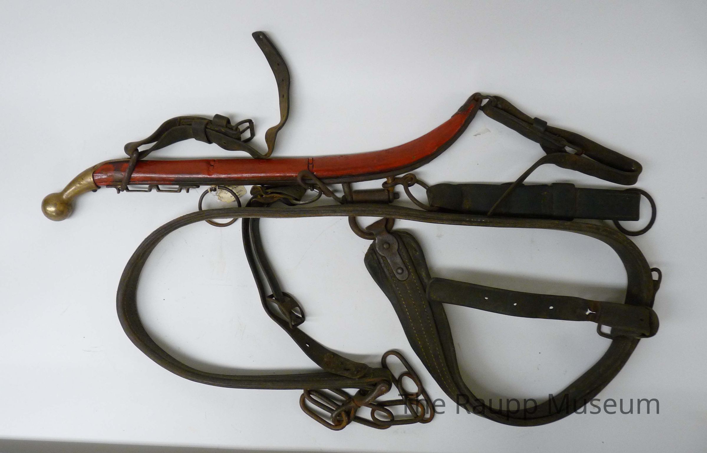 One (1) wood, metal and leather horse harness. The wood piece is long, rectangular with red paint on one side and a brass bulb on one end. There are multiple leather pieces attached of different shapes and sizes. Original artifact card says: "Draft Horse Harness -Right - 1900".