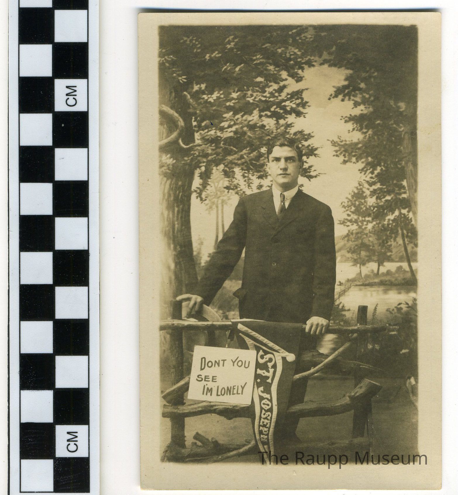 Black and white print with white border printed on postcard. Image of a man in a dark suit standing behind a wood fence with banner and sign attached to it. The banner text: "St. Joseph" and the sign text: "Don't you see I'm lonely." Forrest and water backdrop scene behind him. reverse side has postcard text with a split back. Handwritten ink text in address space in the center right area: "Uncle Harry Ackerman".Relationships