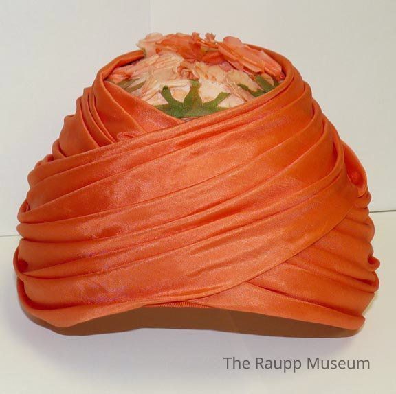 Turban shaped peach color hat. Ruche fabric covering cross draped over a base layer of plastic netting. The top of the dome is flat with peach color artificial fabric flowers covering it.Dimensions