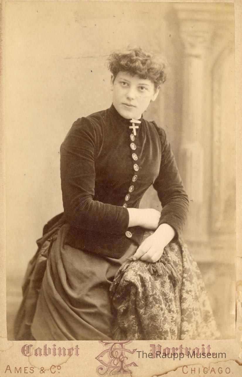 One (1) sepia toned black and white photographic print attached to a tan cardboard frame. Image of "Helena Metz, Grandma Raupp friend, Mary K.", according to handwritten text on back. The woman is learning with her arms resting against a chair with a embroidered blanket over it. She is wearing a dark colored skirt with ruffles in the back and a black top, buttoned all the way in the front with decorative buttons. She has a cross necklace. Her hair is pulled back and curly in the front. There are Greek style columns in the back behind her on her left. The frame has "Cabinet Portrait, Ames & Co. Chicago" on the front, and "Ames & Co. Photo Art Atudios 212 & 214 State Street 3035 Indiana Ave. Chicago, Crayon, India Ink and Water Color Portraits Specialty" written on the back with a pot with flowers, bird, and butterfly decorative design.