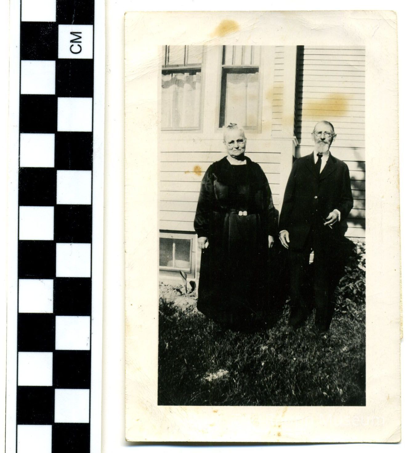 Black and white image with white border. Image of Henry Neibur and Anna Weidner. She is standing on the left wearing a dark 1910s tunic style dress with a belt with her hair in a high bun. He is standing on the left wearing a dark suit, necktie and eye glasses. He is holding a cigar. The exterior windows of the couple's house are behind them.Relationships