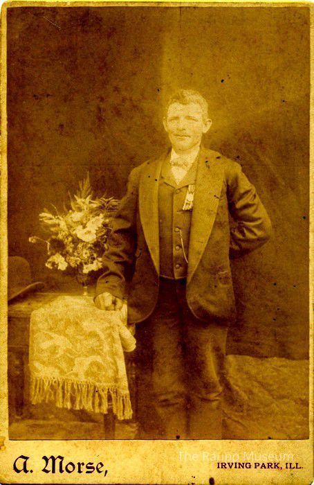 One (1) black and white sepia toned photograph of Henry Schmeiser (some connection to Brehms, but it is unknown). Henry is standing with this right hand on a small table on this right. There is a decorated cloth with fringe. There is a bouquet of flowers on the table as well. He is standing on a cloth rug. He is wearing a dark colored suit with white undershirt and black cloth bow. He has on a medal and ribbon attached to his inner left lapel. The photo is attached to a beige cardboard backing. On the bottom is printed in red: "A. Morse, Irving Park, ILL."