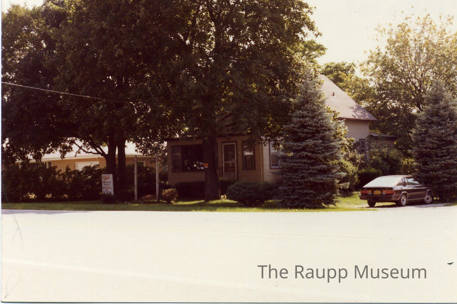 Color photographic print. Image of the exterior of Henry Weidner's home located on Buffalo Grove Road. Image taken from across the street. House is bungalow style and partially obscured by a large tree in front of the property. A "For Sale" sign on the left side of the image in the yard with a brown car parked in the driveway on the right side. reverse side stamp: "Print made by Kodak Aug 81." Image printed on Kodak paper.Relationships