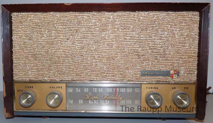 AM/FM radio with rectangular wood casing in dark finish, a tweed tan speaker covering with dials and tuning panel across bottom. Magnavox logo and crest in lower right corner of front. Back panel made of perforated fiber board. Has antennae slot. Also with a two-prong electrical cord with plastic casing.Dimensions