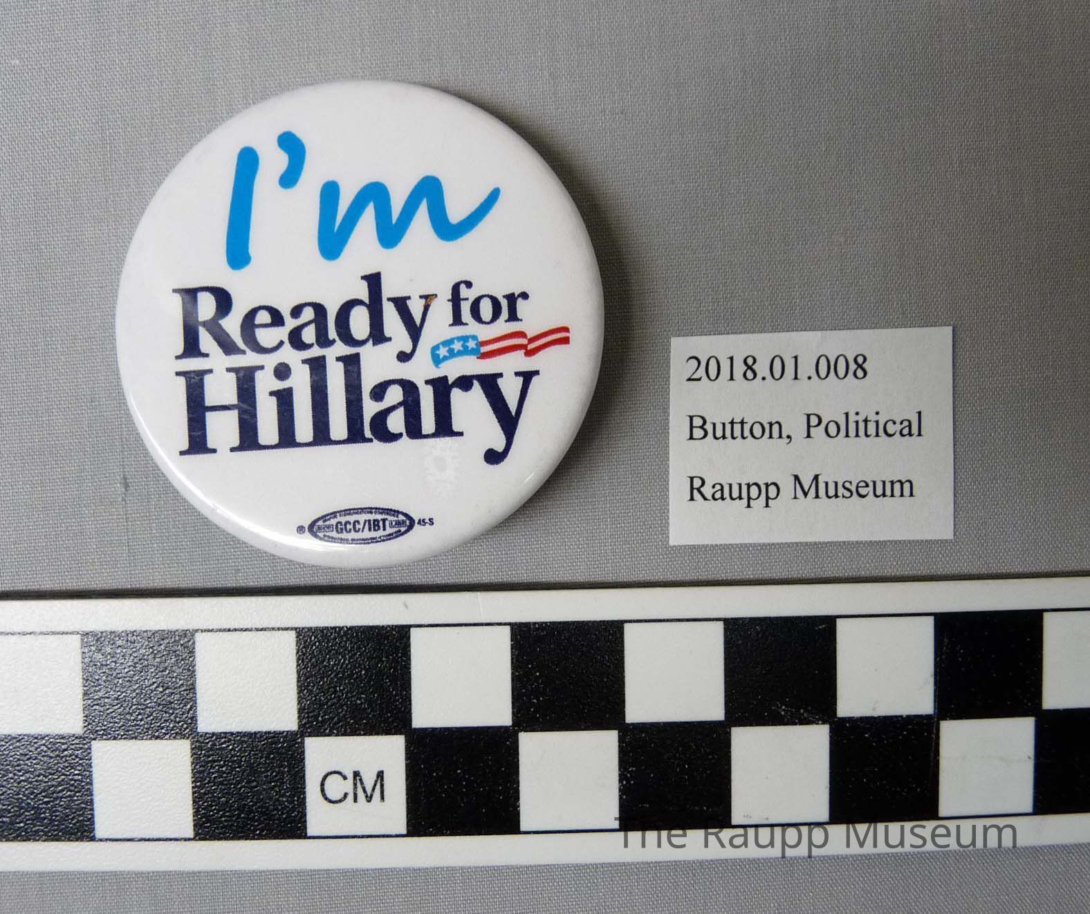 One (1) political button. The pin has the text ""I'm Ready for Hillary" on one side, and silver on the back side. The button is white, blue, red, and black. There is a safety pin affixed to the back.Condition