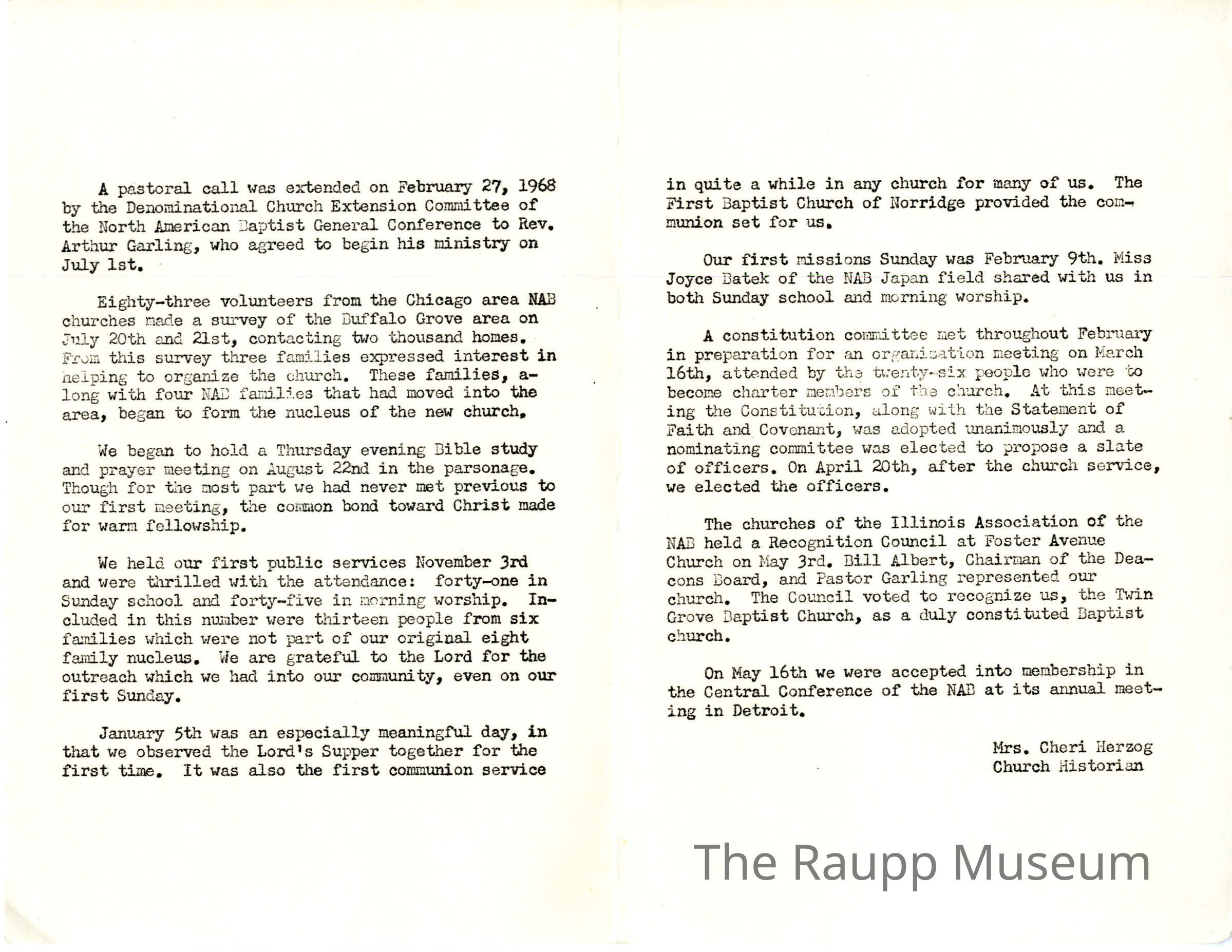 One (1) typed 2 single-sided history of Twin Grove Baptist Church. History was typed on a typewriter. This page is a continuation of the first page, and has two pages of history, with "Mrs. Cheri Herzog, Church Historian" at the bottom right.Archive Details