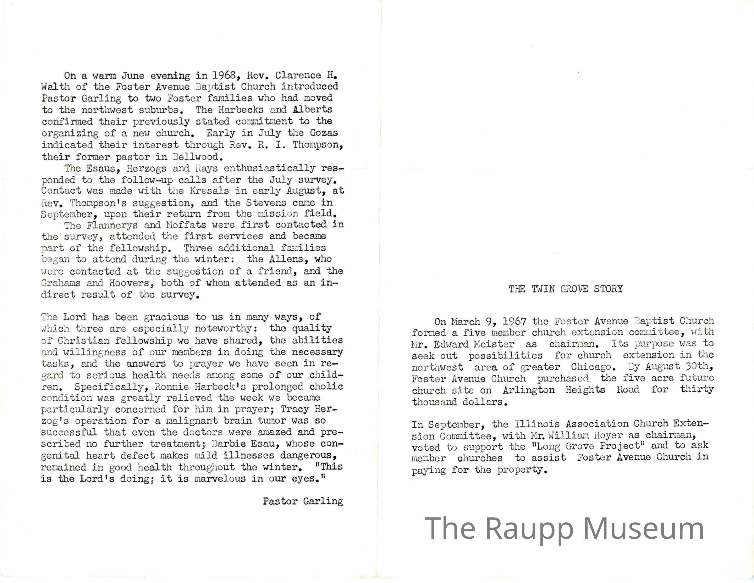 One (1) typed 2-page history of Twin Grove Baptist Church. History was typed on a typewriter. This page is single-sided and has a message from Pastor Garling on the left side, and a half page beginning history of the church, with the title "The Twin Grove Story".Archive Details