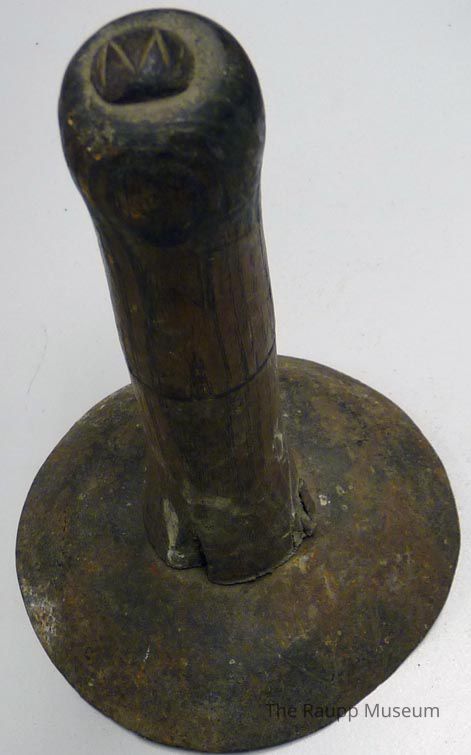 One (1) metal and wood hog hair scraper. Uneven circular metal cup attached by screw to wooden handle. Handle has a metal grommet with "W" engraving on the top.