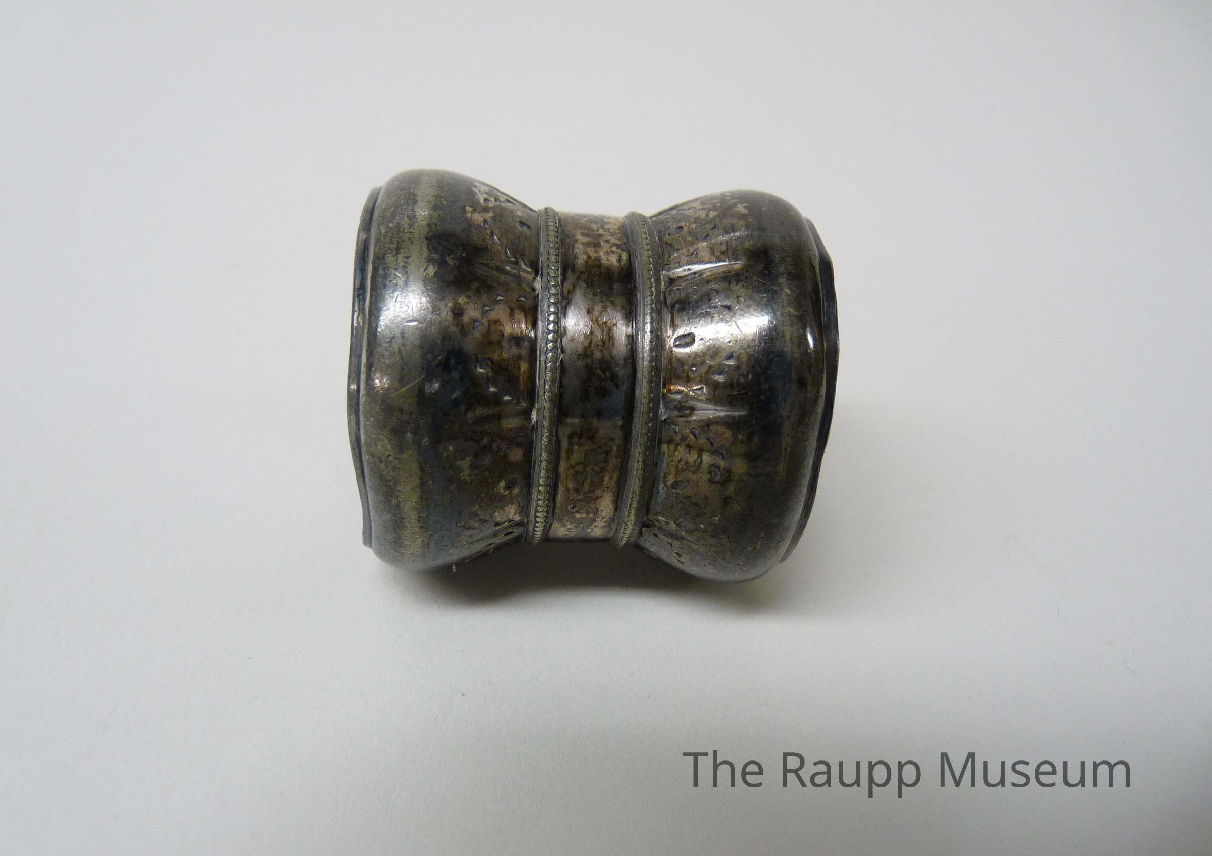 One (1) silver circular napkin holder. Napkin holder is narrow at the mid section and flares out at both ends, with the rim bent inward. One end the rim is slightly bent in two different places. There are two decorative bands in the center with small dot design with a leaf-like and triangle embossed design coming off the center on both sides, on the outside.
