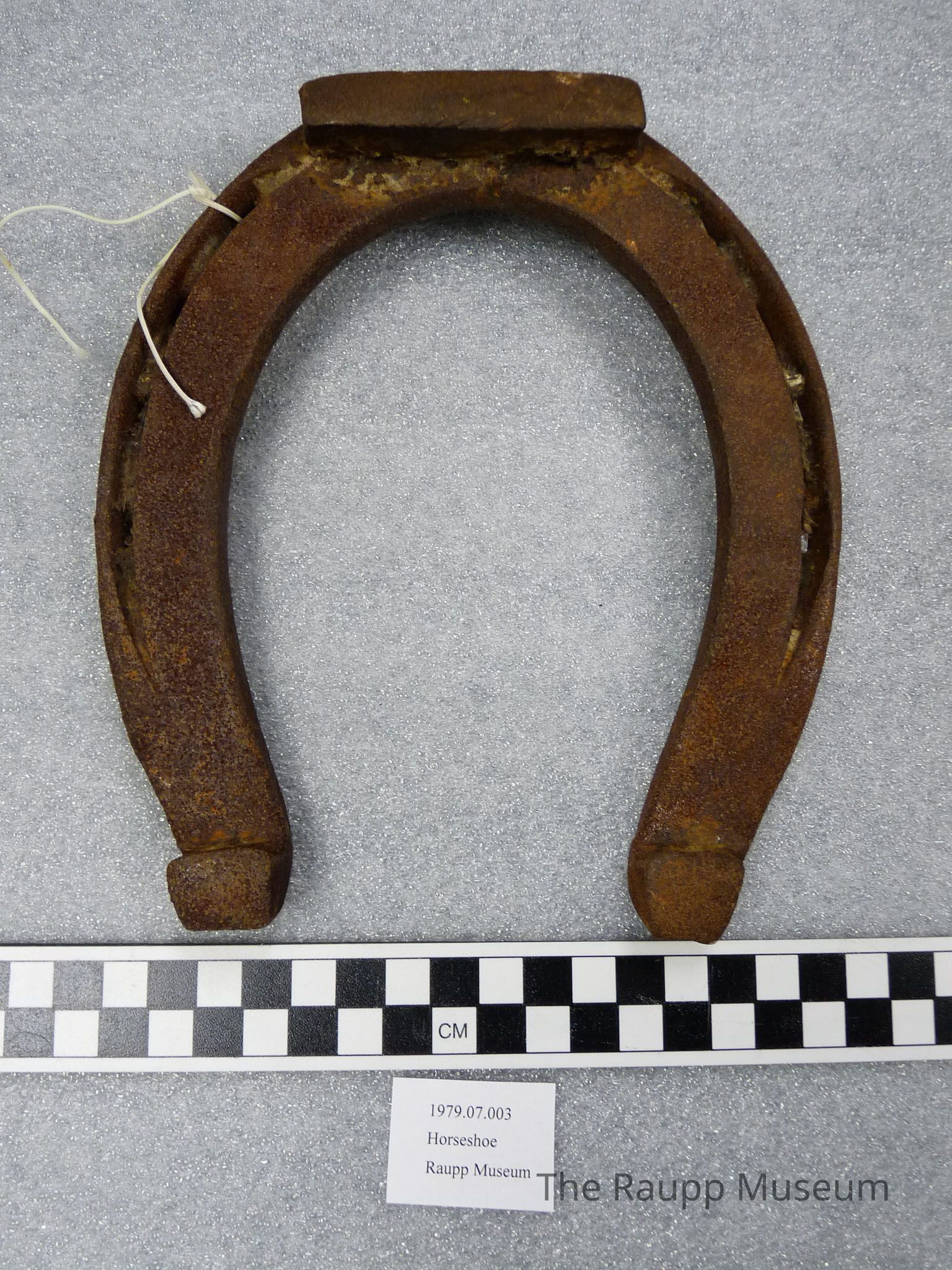 One (1) black, brown, and red iron metal U-shaped horseshoe (larger than normal). There are 4 rectangular holes down each side near the outside of the horseshoe, and a two crescent grooves through the holes and extends until about the last holes on each end. There are two raised knobs on the front ends, a large rectangular metal piece attached on the top, and 1 flange on the underside on the top. The back is flat, while the front is slightly curved along the edges.Dimensions