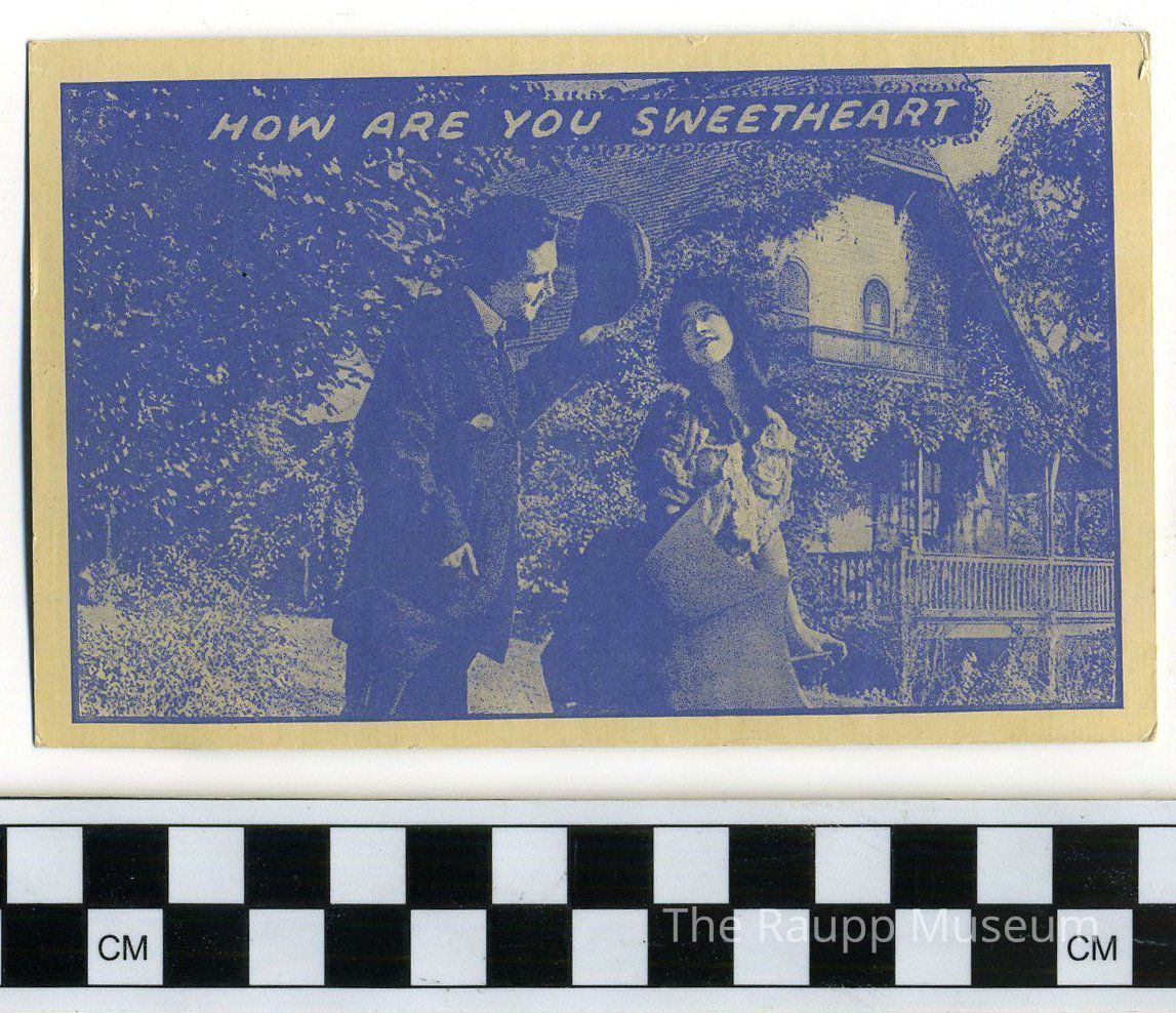 Postcard with cyanotype image on the front and postcard text on the reverse. Front illustration of an early 1910s woman standing in front of an ivy-covered house with an umbrella. A man greeting her with his hat in his hand standing on the left. Printed text in upper left corner: "How are you sweetheart" reverse side has divided back postcard text