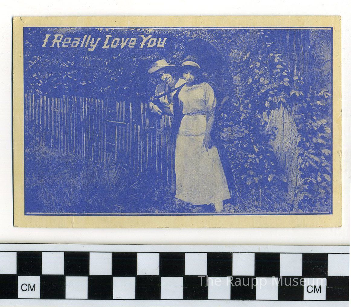 Postcard with cyanotype image on the front and postcard text on the reverse. Front illustration of an early 1910s woman wearing a hat, wearing a long skirt and leaning on wooden fence. A man standing on the other side of the fence looking at her. Printed text in upper left corner: I REALLY LOVE YOU." reverse side has divided back postcard text