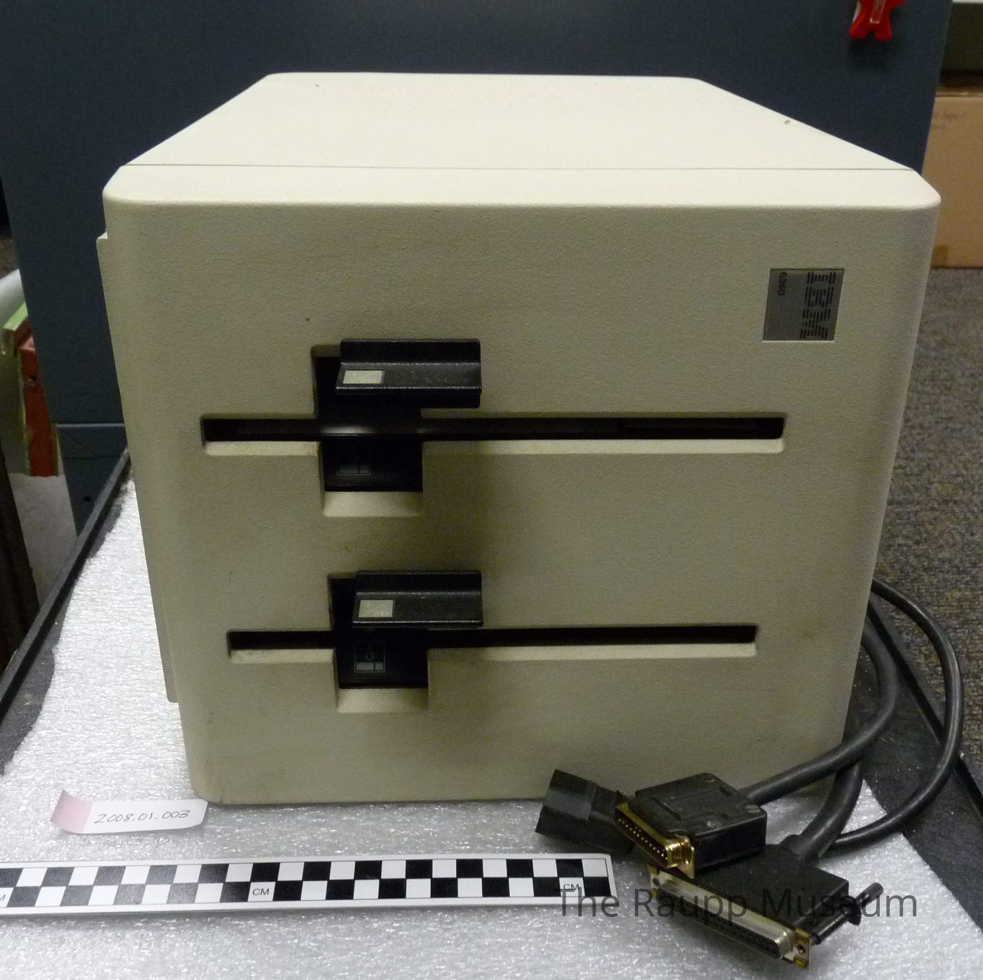 One (1) white floppy disk drive reader for IBM computer. Disk reader has a white covering, 2 slots for disks, black bottom with cords attached to CPU, air vents for cooling and power plug.Dimensions