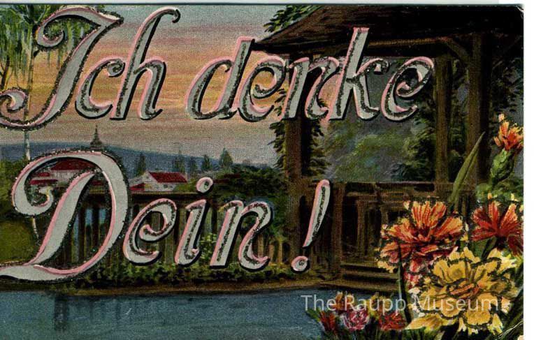 Color postcard with glitter and background image of a town with a water feature and gazebo with flowers on the far right. Center of the card says, “Ich denke Dein!” in pink and blue lettering and glitter.