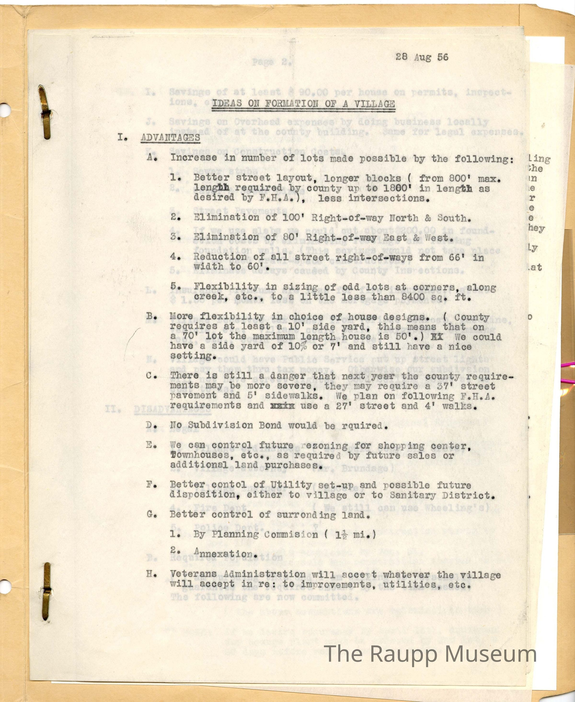 Five (5) page typed document enclosed in a manila folder, including a small cut picture of Rabbi Winchester clipped to the back. Document was typed on a typewriter, and includes Advantages and Disadvantages of forming a Village in Buffalo Grove, and Alternate Proposal for Village Formation. Written by Al Frank. At the back is clipped a cut picture of Rabbi Winchester from the side.Archive Items Details