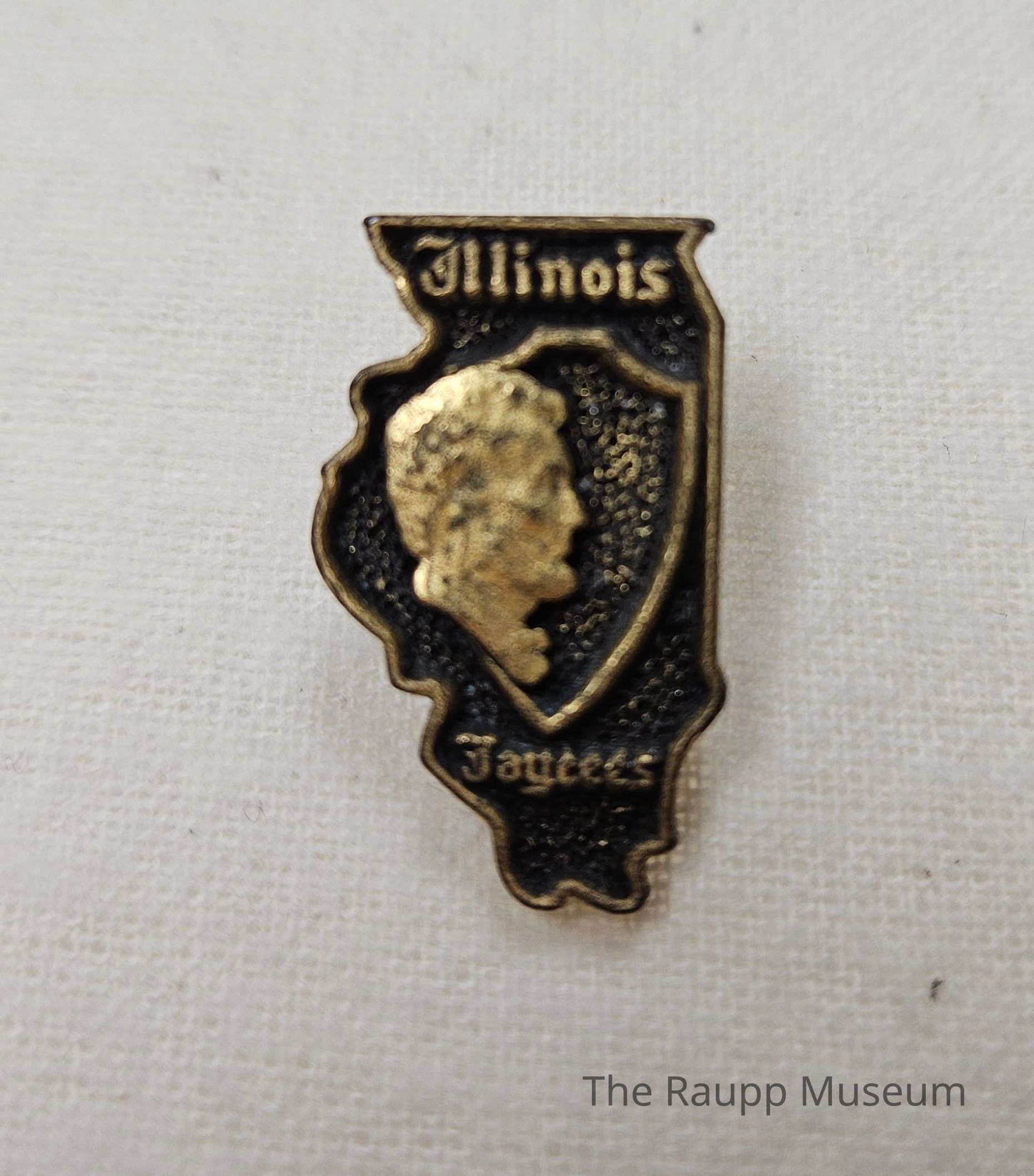 One (1) metal Jaycees pin, in the shape of the State of Illinois. Pin is black with gold accents. In the center is the side profile of Abraham Lincoln, and "Illinois Jaycees" printed top and bottom. The back has one pin stop attached.Relationships