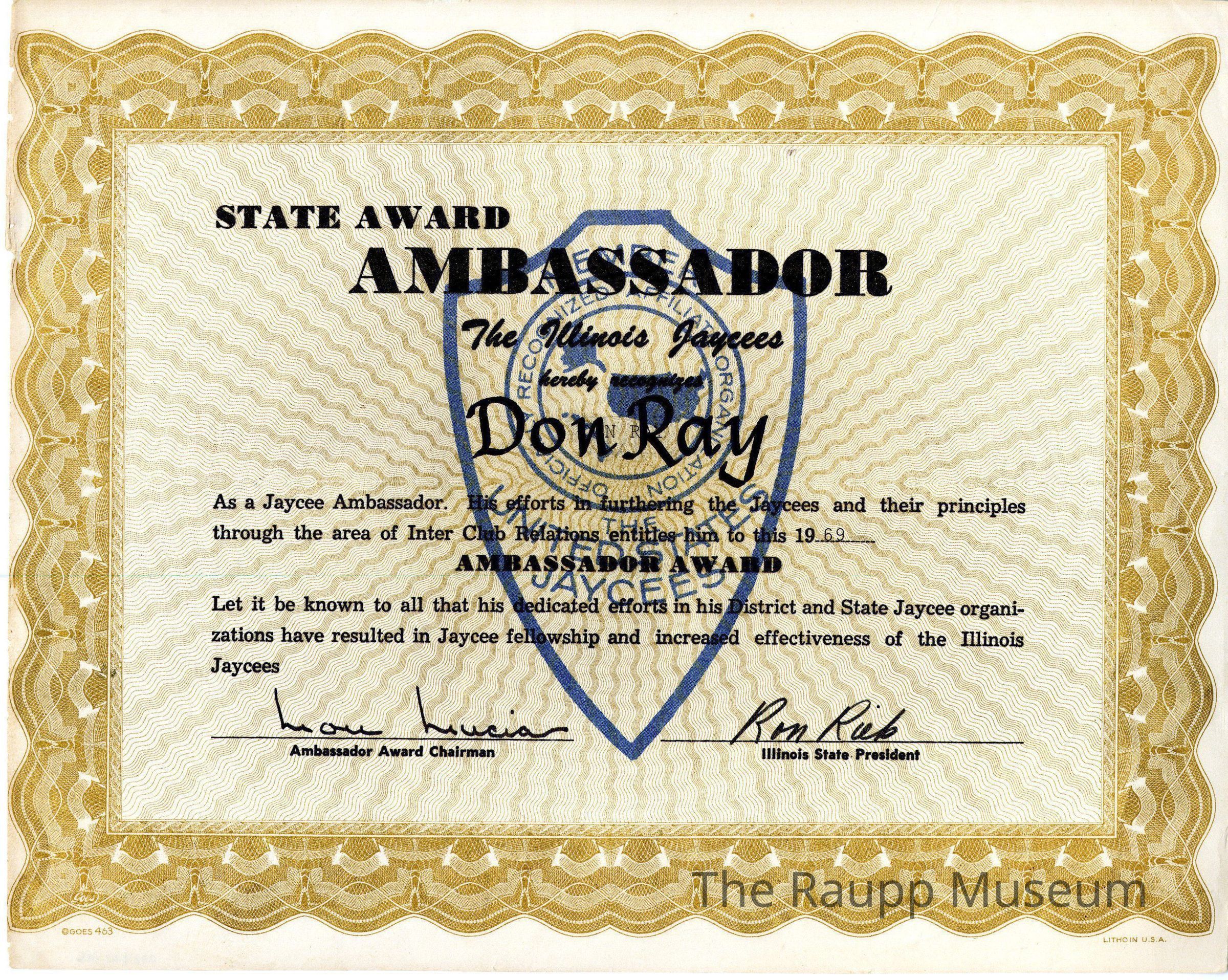 One (1) gold, white, and black State Award Ambassador certificate for Don Ray in 1969. Award has a decorative gold border, with gold wave lines going from the center outward. There is a blue Jaycees insignia printed behind the text in the center. Award is signed by Ambassador Award Chair and Illinois State President.Relationships