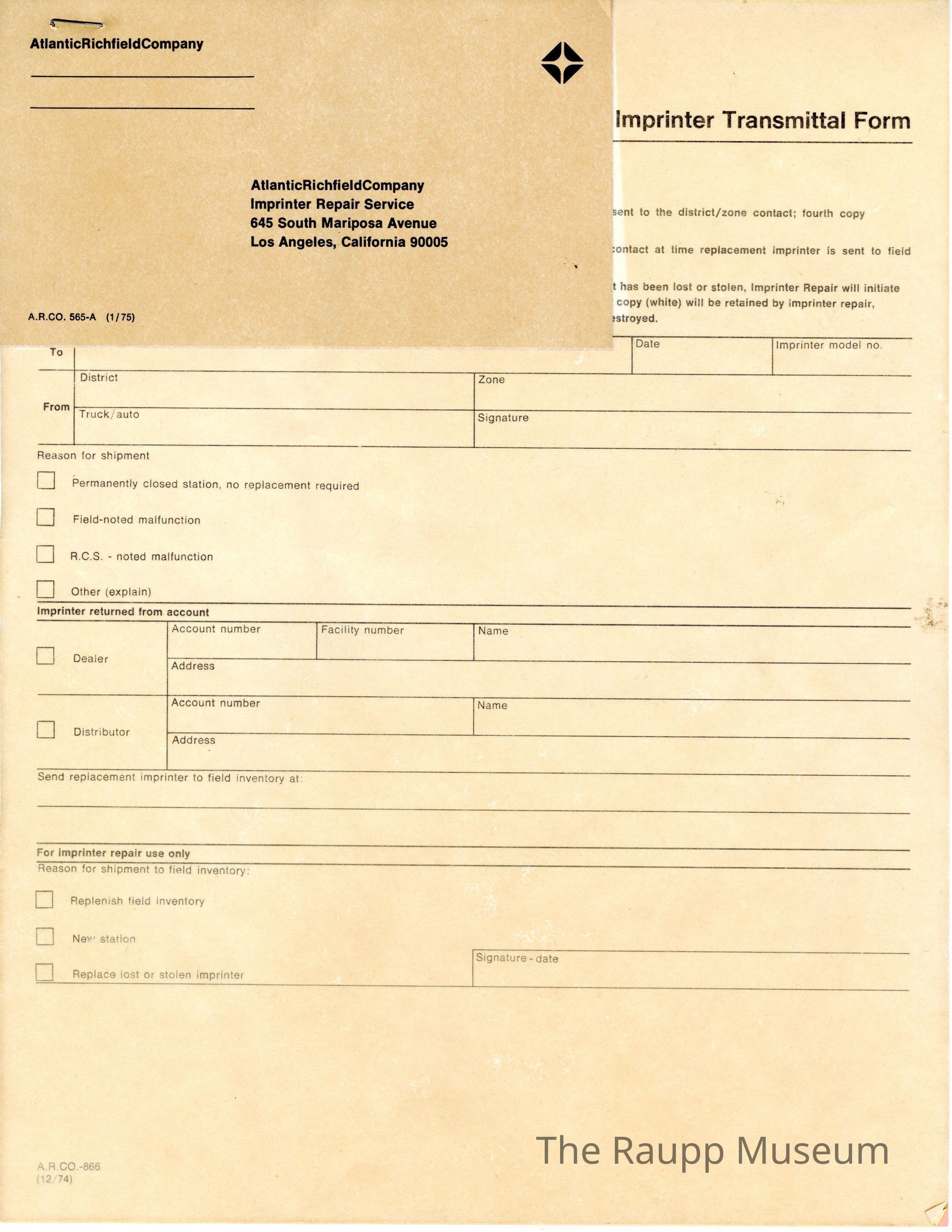 One (1) Imprinter Transmittal Form with four pages total (receipts) and a top sheet stapled to the top along with a receipt copy to imprint credit card information on. The form is white on top with orange, pink and beige sheets behind it. When you lift the small top sheet (maybe was sticker?), you can see the heavy discoloration from light damage. Was enclosed inbox with ARCO Credit Card Imprinter machine.