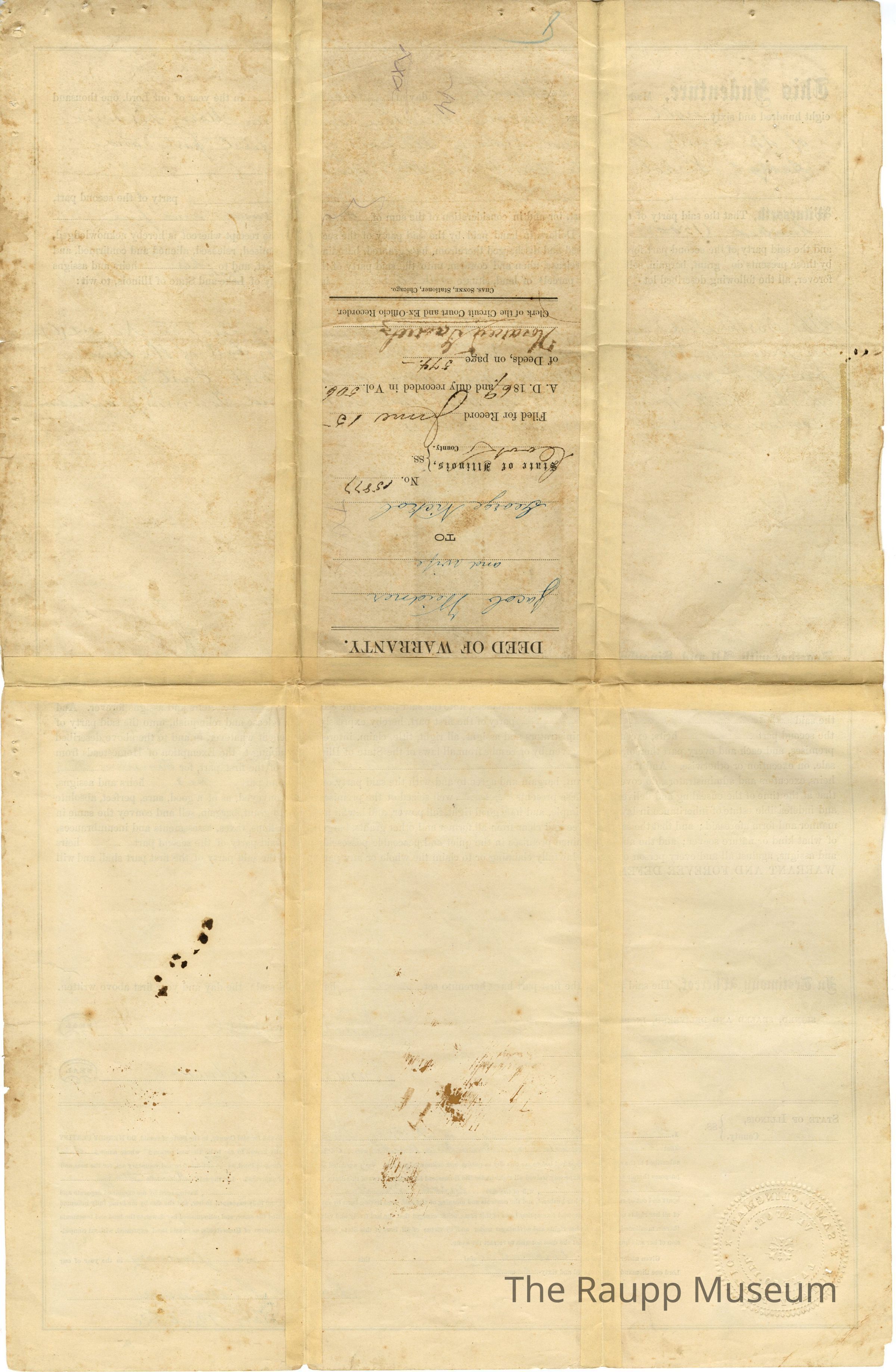 One (1) Indenture, Jan. 8, 1868. George Nickol 60 acres from Jacob Weidner for $1500.00, white paper, folded into sixths, 16" x 10", blue 50 cent stamp and red 1 cent stamp on front.Archive Details
