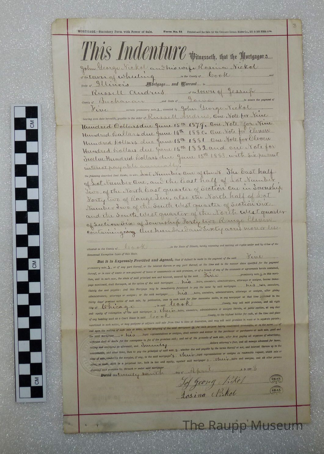 One (1) Indenture, April 27, 1878. On the purchase of 161 acres by Johann Nickol from Russel Andrus of Jessup, Buchanan Co., Iowa for $5200.00. White paper, quarter folded, 13" x 8".Archive Details