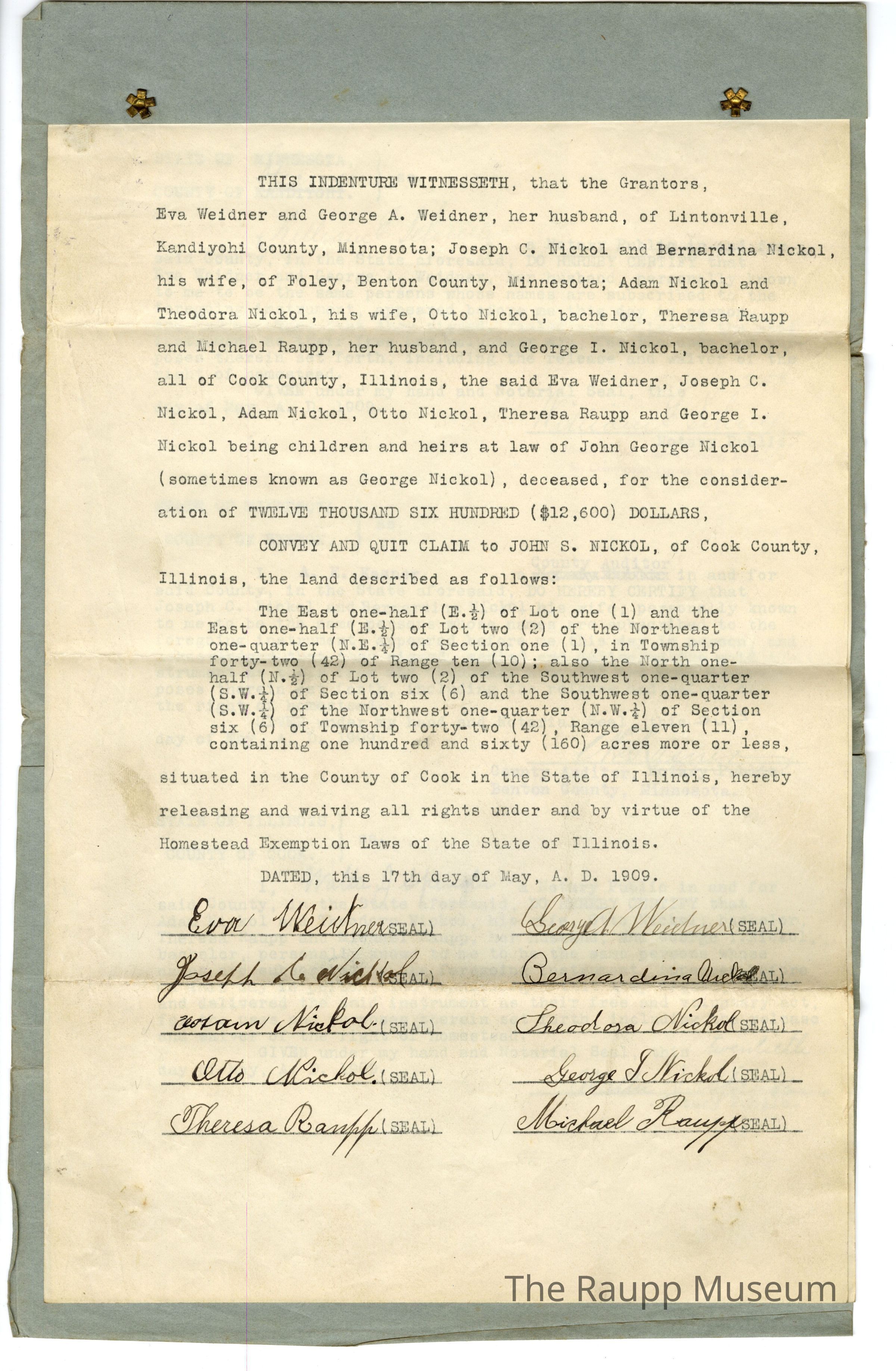 One (1) Quit Claim Indenture of land in Buffalo Grove and nearby to John S. Nickol, from Eva and George Weidner, Joseph and Bernardina Nickol, Adam and Theodora Nickol, Otto Nickol, Theresa and Michael Raupp, and George Nickol. Dated May 17, 1909.