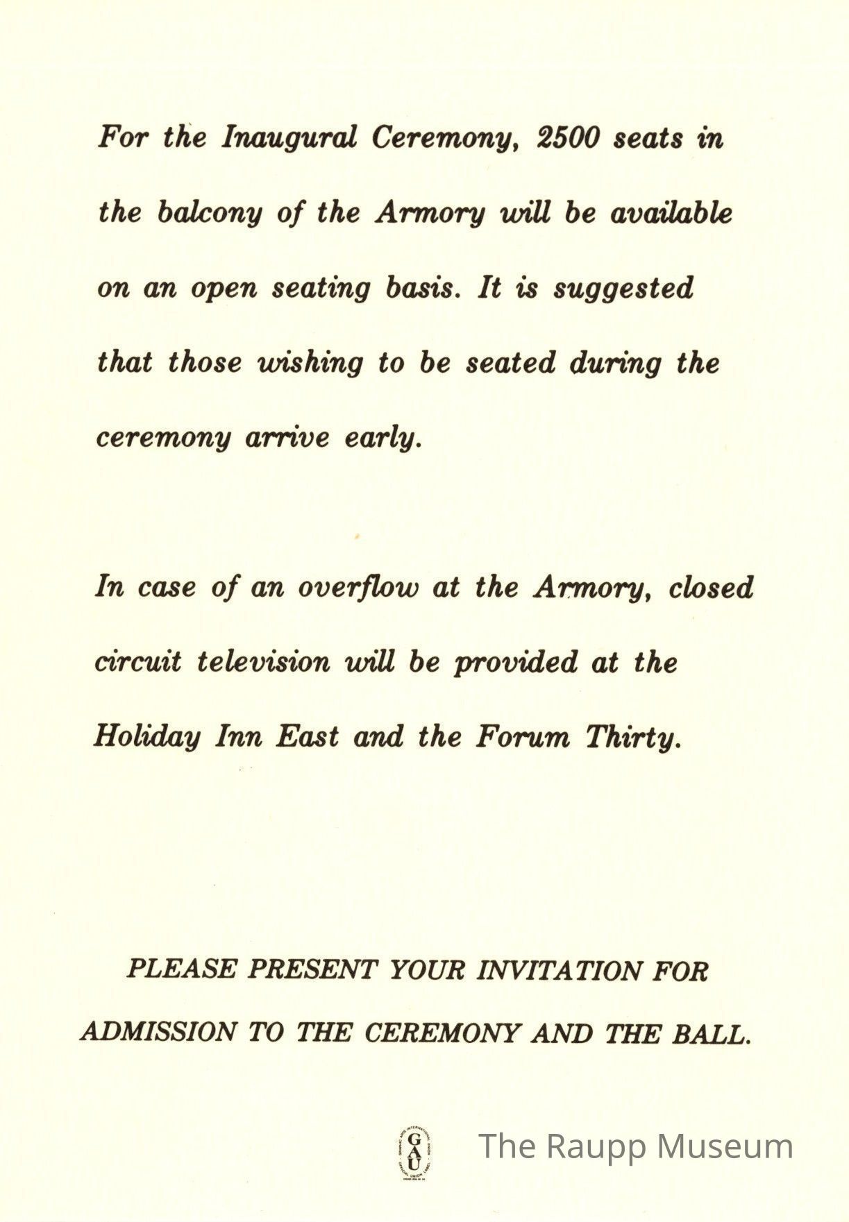 One (1) 4." x 6" printed invitation insert for inauguration of Illinois Governor Jim Thompson, Lieutenant Governor David G. O'Neal, Attorney General William J. Scott, Secretary of State Alan J. Dixon, Comptroller Michael J. Bakalis on January 10, 1977 at The Armory in Springfield, Illinois. 2500 seats are available in the Armory balcony with overflow seating at the Holiday Inn and Forum Thirty.