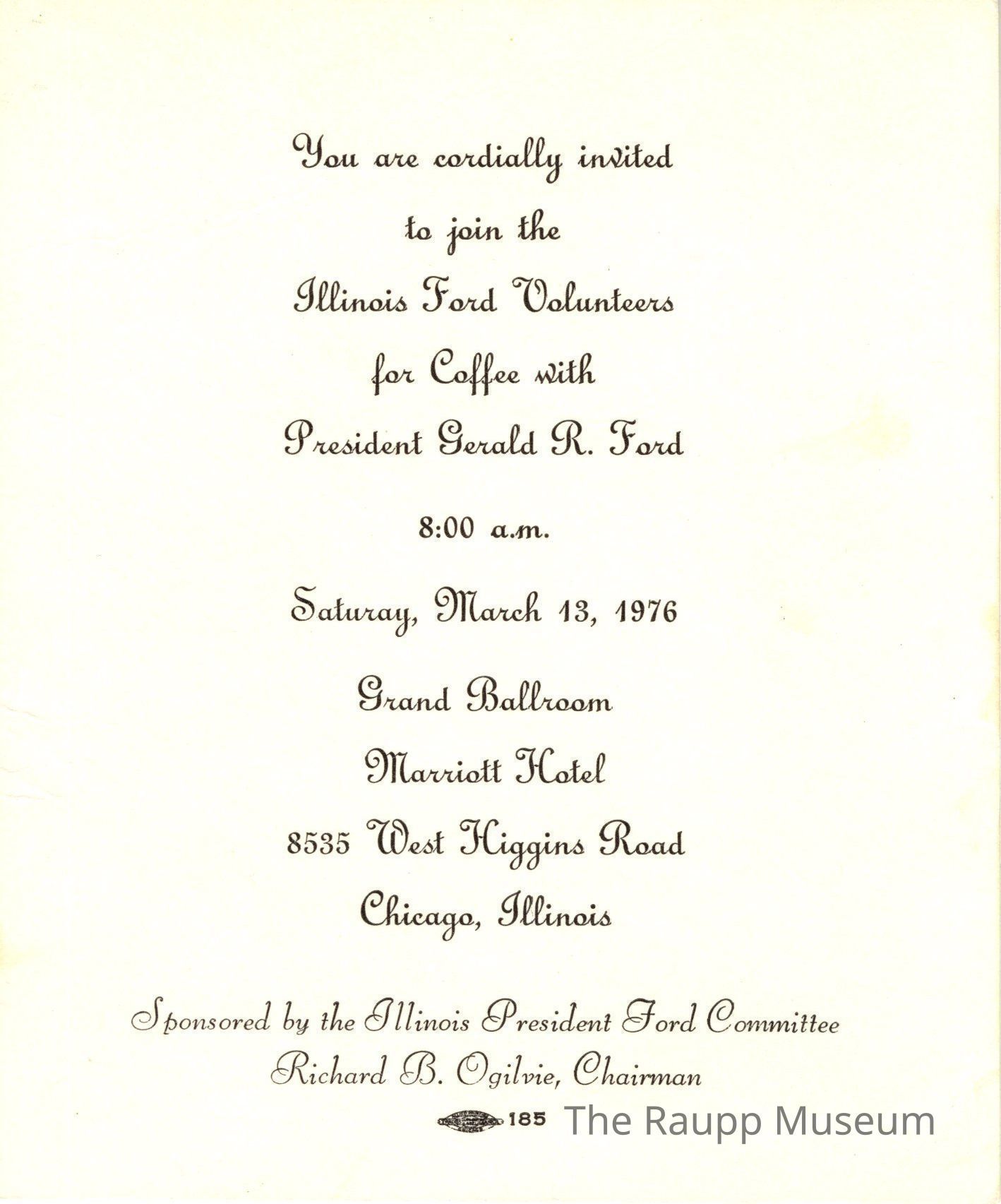 One (1) 4.75" x 5.5" printed invitation to Illinois Ford Volunteers to have coffee with President Gerald R. Ford on March 13, 1976 at the Grand Ballroom of the Marriott Hotel, Chicago, Illinois. Sponsored by Illinois President Ford Committee, Richard B. Ogilvie, Chairman. Printers mark at the bottom.Relationships