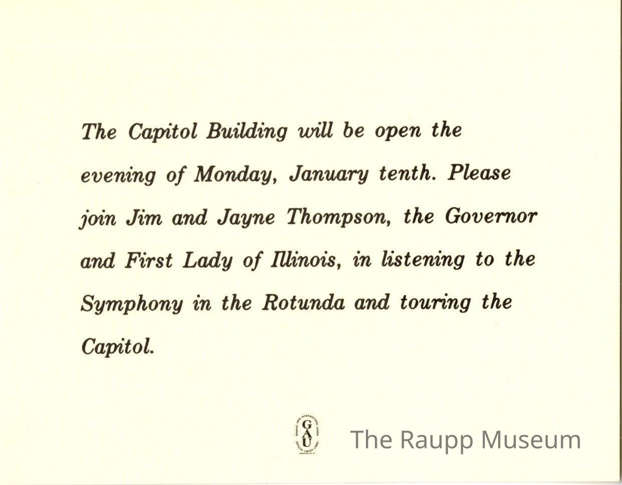 One (1) 4" x 3.25" printed invitation insert for inauguration of Illinois Governor Jim Thompson, Lieutenant Governor David G. O'Neal, Attorney General William J. Scott, Secretary of State Alan J. Dixon, Comptroller Michael J. Bakalis on January 10, 1977 at The Armory in Springfield, Illinois. The Capitol Building will be open for a symphony concert in the Rotunda.Relationships