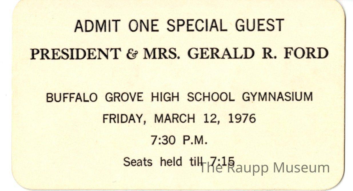 One (1) 4"x 2.25" printed cardstock ticket to President Gerald R. Ford appearance at Buffalo Grove High School on March 12, 1976.Relationships