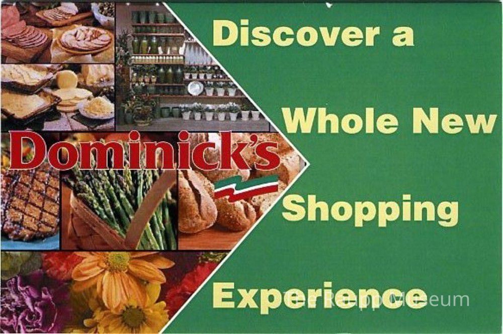 Horizontally folded invitation for the grand re-opening VIP program and Preview Party on May 18, 2007 for Dominick's grocery store at 770 S. Buffalo Grove Road in Buffalo Grove. Dominick's Logo and photos of food on cover.Condition