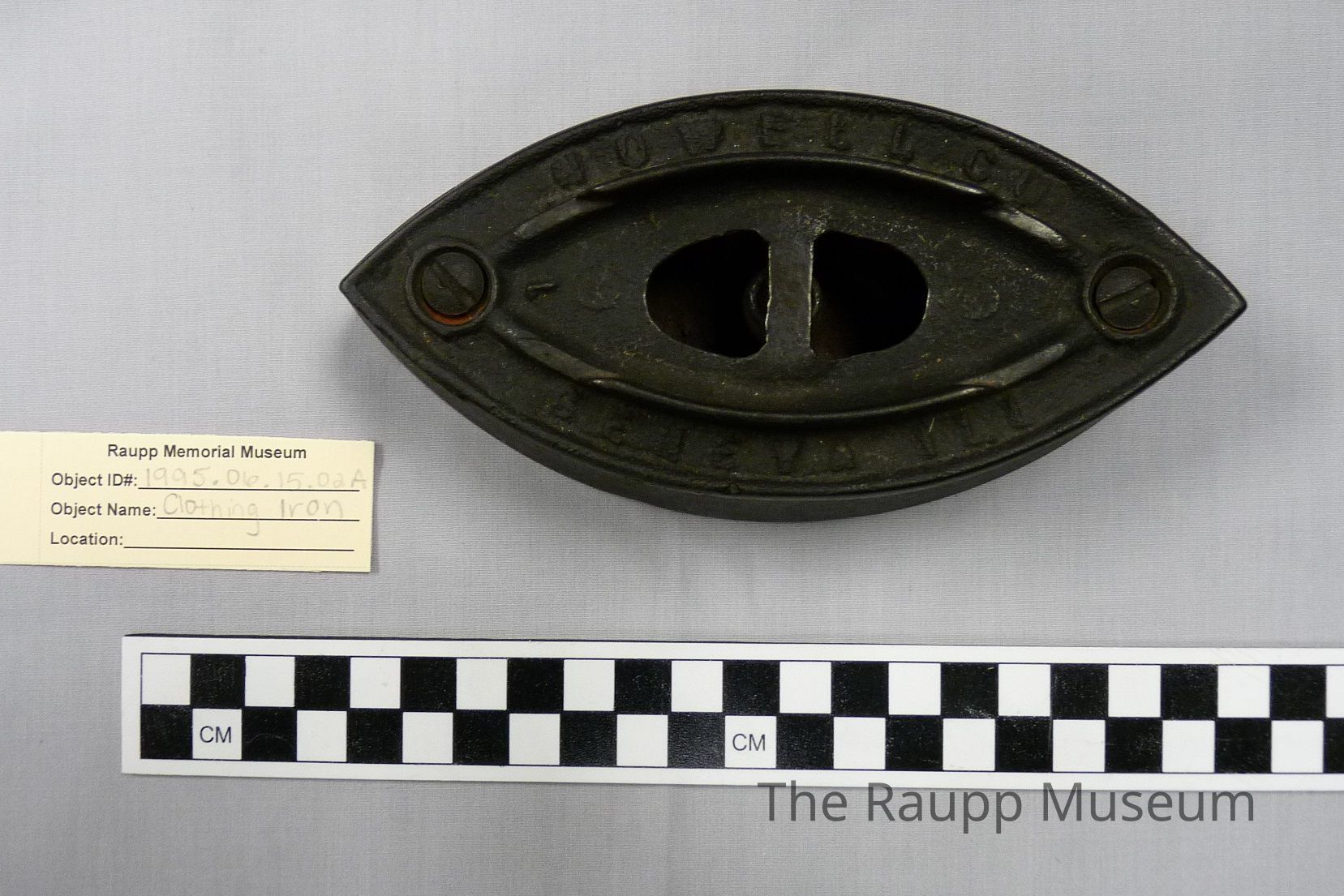 One (1) black iron base. The object is oval shaped with pointed ends. The top part of the base is secured with two screws mounted on the top. The top part has two symmetrical openings that secure the handle. The top also has a raised inner band and a raised makers mark. The bottom part of the base is hollow with a raised solid metal cylinder in the center under the two opening on the top part. The rest of the sides are flat and smooth.Dimensions